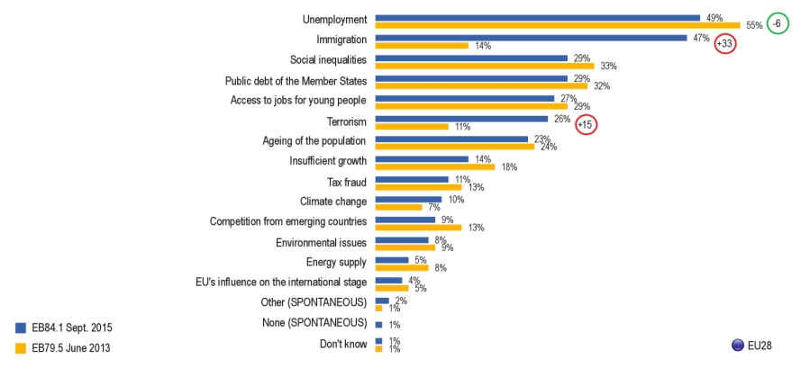 [responsive_vimeo 147594273]Tra giugno 2013 e settembre 2015, infatti, è aumentata del 33% la quota degli europei preoccupati per l’emergenza immigrazione. Nello stesso periodo di tempo è calata la quota di coloro che sono preoccupati per il lavoro. Il tema che cresce di più nella classifica delle priorità è proprio il terrorismo: più 13%.