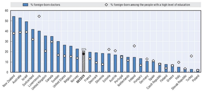 Non era ancora esplosa in tutta la sua drammaticità l’emergenza immigrazione, ma i dati del 2011 sugli “skills” degli immigrati mostrano una spaccatura netta tra i Paesi che compiono una selezione all’ingresso e quelli che non lo fanno. Il grafico, infatti, mostra la percentuale di persone immigrate con un’alto grado di educazione e, tra di loro, la percentuale di medici. Degli immigrati italiani solo il 10% ha un alto livello di educazione e solo il 5% sono medici. Nei Paesi a noi paragonabili entrambe le percentuali sono molto più alte.