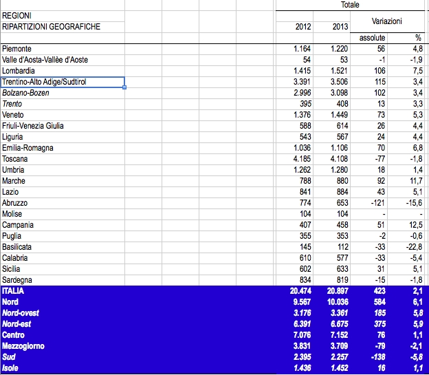 Nel 2013 il numero delle aziende agrituristiche erano 20.897, 423 in più rispetto al 2012. Il saldo è il risultato di 1.697 nuovi agriturismi e di 1.274 cessazioni dell’attività. Rispetto al 2012 aumentano soprattutto nel Nord (+6,1%) e meno nel Centro (+1,1%), mentre calano nel Mezzogiorno (-2,1%).