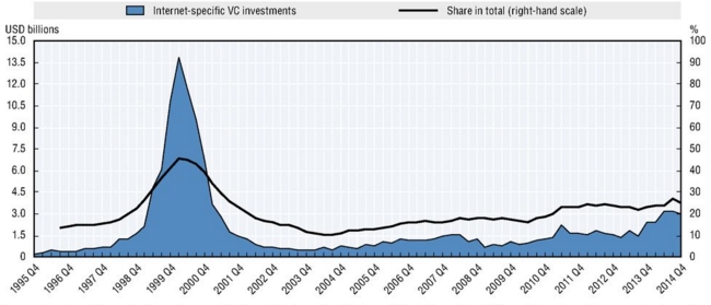 Bei tempi quelli delle dotcom. Il 45% degli investimenti dei venture capital americani destinati all’Information & Communication Technology finivano nelle casse delle società che si occupavano specificamente di Internet e che da Internet traevano la maggior parte dei loro ricavi.