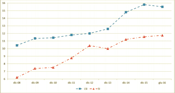 Di fatto è un indice del patrimonio di migliore qualità, quello che deve garantire i prestiti concessi ai clienti e soprattutto quelli non più esigibili, i famosi NPL, “non performing loans”. Il CET1 Ratio nelle banche più piccole, le LSI, è cresciuto dal 2011 ad oggi raggiungendo il 15,5% nel giugno 2016, mentre quello delle banche più grandi è salito solo al 11,7% in media, come si vede dal grafico qui sotto. Nel caso delle BCC, anzi, questo rapporto è ancora maggiore oggi, il 16,6%