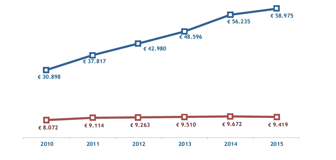 Come si vede, l’ammontare dei crediti affidati alle agenzie di recupero è in continuo aumento e, nel 2015, è arrivato a 58.975 milioni di euro. Il valore dei crediti che invece le agenzie riescono a recuperare oscilla, da quattro anni, intorno a poco più di 9.510 milioni di euro. Tra il 2010 e il 2015 è aumentato anche il valore medio dei debiti, da 1.385 euro a 1.547 euro.