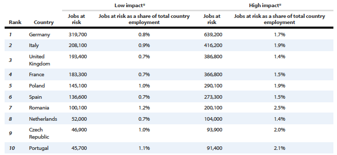 Lo studio di Scott entra anche nel dettaglio dei paesi europei che potenzialmente sarebbero più colpiti in termini di occupazione dal riconoscimento alla Cina dello status di economia di mercato. In cima per numero di posti di lavoro a rischio c’è la Germania, con un intervallo compreso tra 319.700 e 639.200, seguita a stretto giro dall’Italia, con una stima tra 208.100 e 416.200, mentre si calcola 193.400-386.800 per il Regno Unito e 183.300-366.600 per la Francia.