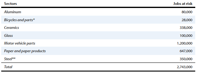 Le conseguenze economiche della concessione dello status di economia di mercato alla Cina. I dati si riferiscono al 2015. Fonte: Economic Policy Institute.