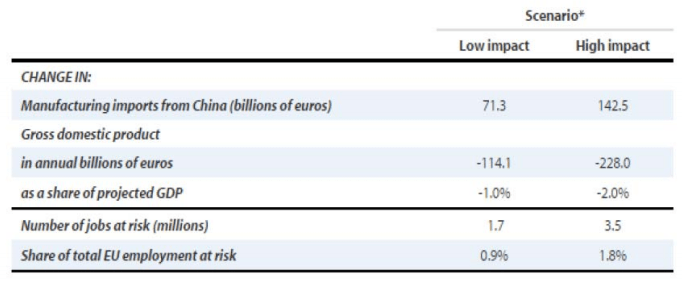 Dietro ai posti di lavoro a rischio, come detto stimati nel complesso da Scott tra 1,75 e 3,49 milioni, si nasconde un aumento di importazioni di prodotti manifatturieri dalla Cina stimato in un intervallo tra 71,3 e 141,5 miliardi di euro. Ma l’impatto sull’occupazione della Cina economia di mercato non è certo l’unico. Come altra principale conseguenza della mossa, che ha una indubbia valenza economica e politica, Scott calcola anche una riduzione del Pil dell’Unione europea tra i 114,1 e i 228 miliardi di euro, ossia tra l’1 e il 2 per cento.