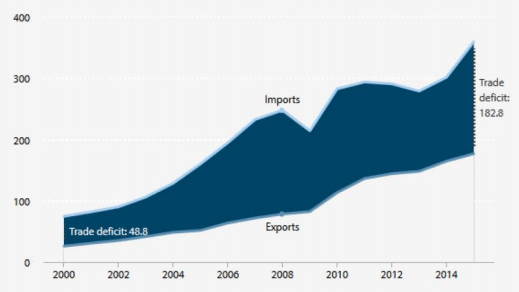 Deficit commerciale dell’Unione europea con la Cina 2000-2015. Fonte: Economic Policy Institute