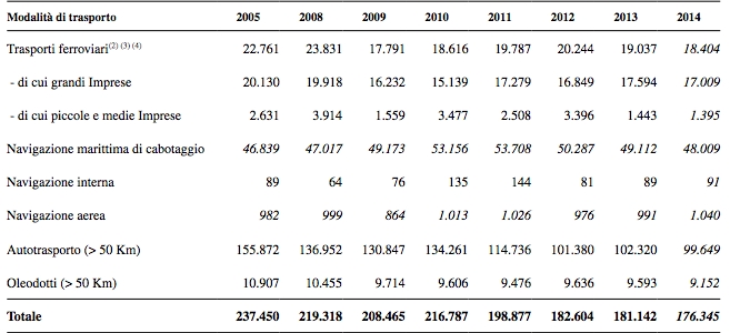 Secondo i dati del ministero, comunque, l’industria del traffico delle merci è in calo costante dal 2005 al 2014 tranne solo la navigazione interna e il trasporto aereo. I valori complessivi, espressi in milioni di tonnellate di merci trasportate per chilometro, mostrano un calo da 237,4 milioni del 2005 a 176 milioni nel 2014 con un crollo vero e proprio per l’autotrasporto a lungo raggio, non compensato da quello a breve raggio. I trasporti ferroviari continuano ad essere ancora poco usati da tutti i tipi di imprese.