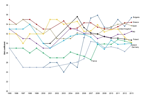 Nel grafico è indicato l’andamento dell’indice di Gini nei vari Paesi europei tra il 1995 e il 2013. L’indice di Gini misura la diseguaglianza nella retribuzione del reddito tra gli abitanti di uno stesso territorio.