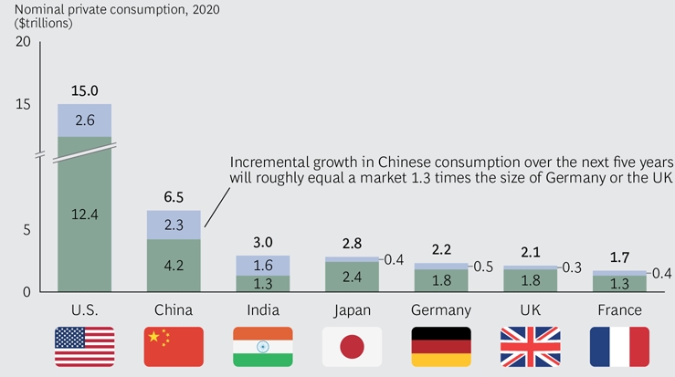 I dati, espressi in trilioni (migliaia di miliardi) di dollari mostrano che l’economia cinese, nonostante sia attualmente attraversata da forti tensioni strutturali, è proiettata verso una crescita portentosa tra il 2015 e il 2020. L’economia di Pechino, infatti, dovrebbe aumentare fino a 6,5 trilioni di dollari anche se il Pil dovesse crescere di solo il 5,5%, cioè meno delle previsioni ufficiali. In questo caso la crescita dei consumi aumenterebbero quindi di 2,3 trilioni, cioè quasi il 50% in più rispetto ad oggi.