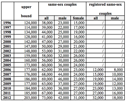 In questa tabella il numero di coppie dormate da partner dello stesso sesso in Germania. Nel 2012, ultimo anno per il quale è disponibile una stima, sarebbero state 73mila, 42mila formate da uomini e 31 mila formate da donne in costante crescita dal 1996 quando la stima parlava di un totale di 38mila coppie. Dal 2006 è possibile registrarsi presso gli uffici pubblici e, quindi, da quell’anno sono disponibili dati assai più affidabili. Il totale delle coppie registrate era, nel 2012, di 32mila, 18mila delle quali formate da uomini.