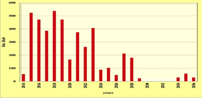 Il 2015 e il 2016 saranno anni durissimi dal punto di vista finanziario per la Russia. Nel grafico è indicato l’ammontare, in miliardi di rubli, dei fondi che il Paese deve restituire ai propri creditori nei prossimi anni. Ce la farà? Ci sono dubbi.