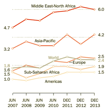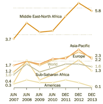 In generale l’indice speciale di Pew Research riguardante sia le restrizioni governative che le ostilità sociale è molto alto, e per anni è cresciuto proprio in Medio Oriente e Nordafrica. Segue l’Asia, dove l’indice mostra preoccupati rialzi anche nel 2013, come si vede dai grafici qui sotto. Gli esempi sono tantissimi. Si va dalle discriminazioni subite dai copti in Egitto, a quelle di armeni e sciiti alevi in Turchia, della Siria e dell’Irak sappiamo tutti, ma forse pochi sono a conoscenza delle grandi difficoltà che gli immigrati asiatici indù, cattolici e buddisti negli Stati del Golfo Persico devono affrontare per avere il diritto di culto in Paesi musulmani tra i più rigidi al mondo.
