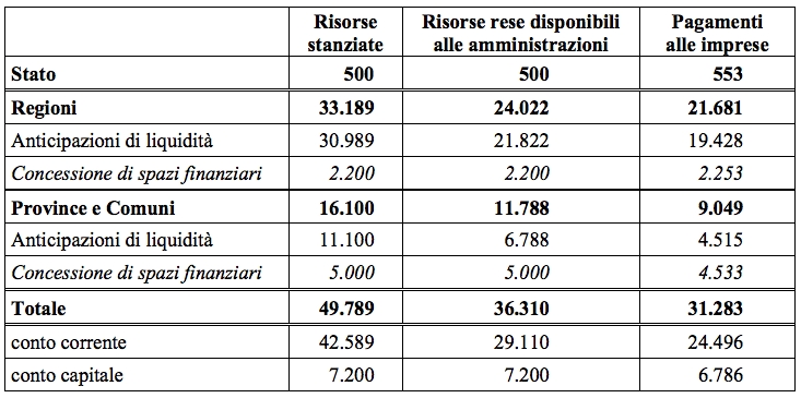 Tra il 2013 e il 2014 solo il 70% degli stanziamenti ufficiali annunciati si sono trasformati in fondi effettivamente disponili per gli enti che dovevano saldare le fatture e quindi la disponibilità del 30% dei fondi era solo un annuncio. Di questo 70% solo il 90% è stato effettivamente utilizzato. Tuttavia il dato davvero allarmante è che nel caso di province e comuni solo il 40% dei fondi disponibili si sono tradotti in pagamenti effettivi. Però i pagamenti effettuati non si sono tradotti in una effettiva riduzione dello stock del debito che, nel biennio, ammontava a 22,1 miliardi.