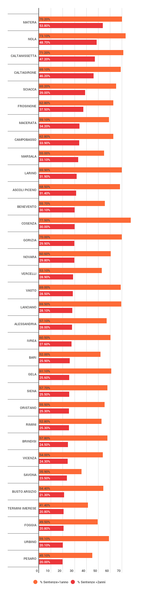 La linea rossa del grafico mostra i Tribunali italiani dove almeno il 20% dei processi penali dura più di due anni. La linea arancione, invece, indica dove i processi penali durano tra 1 anno e 2 anni. Come si vede è Matera il distretto giudiziario con la maggiore percentuale di processi “lunghi”. Ecco i numeri sullo stato della giustizia italiana.