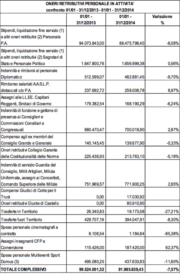 Inoltre, come dimostra la tabella sottostante, la spending review sul Titano non ha risparmiato i costi per il mantenimento della macchina amministrativa pubblica e i costi della politica.