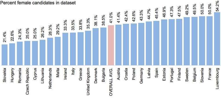 Il 25 maggio del 2014 si sono svolte in tutta Europa le elezioni per il Parlamento di Bruxelles. Solo un Paese si è presentato agli elettori con un numero di donne candidate superiore a quello degli uomini: il Lussemburgo. In tutte le altre 27 nazioni c’erano più candidati uomini che candidate donne mentre in Francia e Slovenia la percentuale era identica: 50%.
