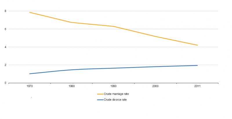 Nel frattempo i divorzi nell’Unione Europea sono più che raddoppiati: da 0,8 per mille abitanti a 2 nel 1965 a 2 nel 2011, quando sono stati dichiarati falliti 986.000 matrimoni. L’aumento dipende anche dal fatto che in questo lasso di tempo il divorzio è stato introdotto in vari Paesi: per esempio, l’Italia (1970), la Spagna (1981) l’Irlanda (1996) e Malta (2011).