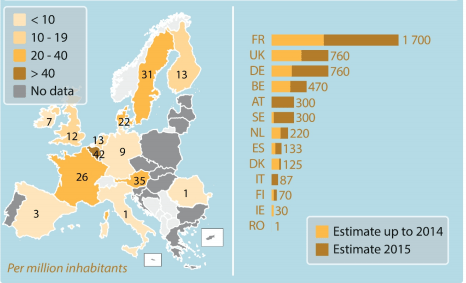 La mappa mostra le più recenti rilevazioni sulle persone che dal Vecchio Continente sono partite per combattere nell’esercito del Daesh (Stato islamico). E’ forse troppo facile collegare il numero dei foreign fighters al fatto che la maggior parte di loro siano originari di quei Paesi europei dove più intensa è l’immigrazione, ma i numeri lasciano pensare che questa relazione esista. La Francia è l’esempio più eclatante: tra il 2014 e la fine del 2015 si stima che almeno 1700 persone abbiano deciso di arruolarsi. Al secondo posto c’è la Gran Bretagna con 760, esattamente come la Germania. Tra i Paesi che forniscono combattenti c’è anche l’Italia. Secondo la rilevazione nel 2014 il numero di foreign fighters italiani era irrilevante, ma nel 2015 sono state 87.