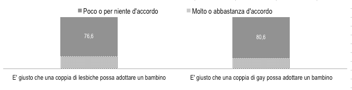 Riguardo al matrimonio, invece, risulta che il 56,1% è “poco o per niente d’accordo” sul fatto che “una coppia omosessuale si sposi, se lo desidera”.
