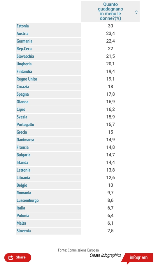 Lo mostra un report della Commissione Europea dal titolo Tackling the gender pay gap in the European Union che possiamo tradurre nel gender gap degli stipendi. Il 6,7% di differenza, che sebbene non significhi certo uguaglianza, ci colloca al quarto posto in Europa. Se consideriamo un costo orario per lavoratore maschio di 100 euro, è come se una donna ne “valesse” 93,3.