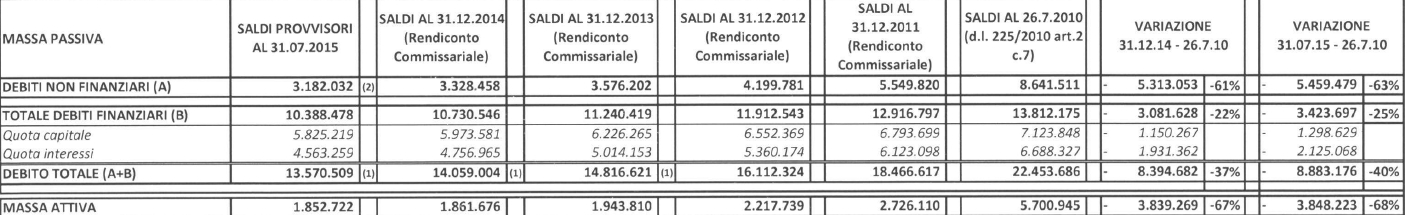 Nella tabella è indicata quanta parte di quei 22,4 miliardi ancora grava sulle spalle degli italiani. Già, degli italiani, perché ogni anno lo Stato versa alle casse della Gestione Commissariale 500 milioni di euro per ripagare, piano piano, i creditori. A fine 2011 i debiti erano 18,4 miliardi; a fine 2012 erano 16,1; a fine 2013 erano 14,8; a fine 2014 erano 14 mentre al 31 luglio 2015 sono diventati 13 miliardi e 570 milioni.