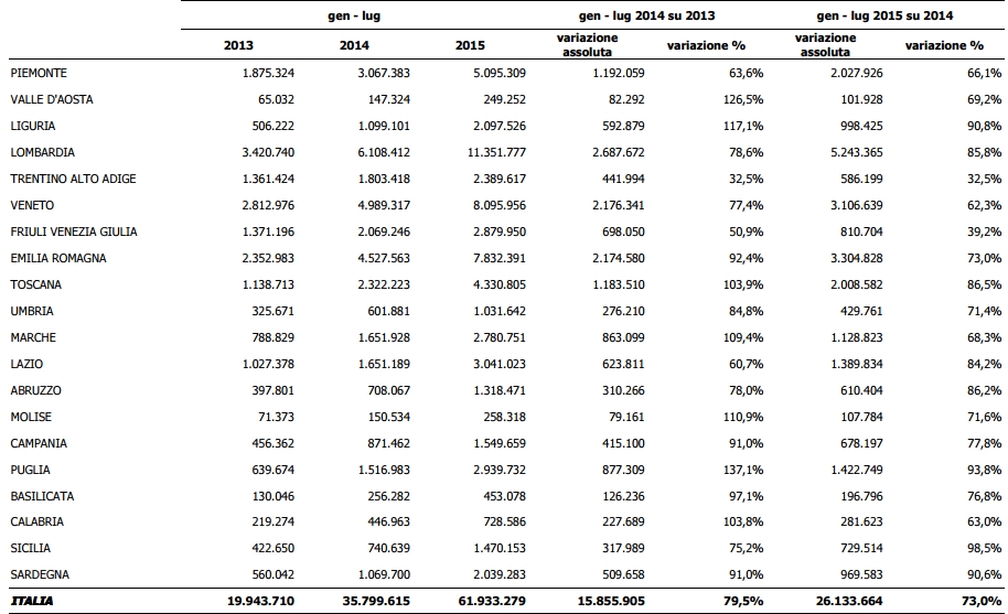 I dati si riferiscono al: gennaio-luglio 2013, 2014, 2015