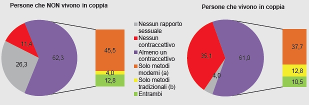 La differenza sta, piuttosto, in quale dei metodi contraccettivi si usa per evitare una gravidanza: le coppie non sposate usano prevalentemente i cosiddetti “metodi moderni” che includono preservativo, pillola, diaframma, anello vaginale, cerotto contraccettivo, sterilizzazione compresa la pillola del giorno dopo. Le coppie sposate fanno maggior ricorso, rispetto a quelle non sposate, a metodi “tradizionali” o “naturali”.