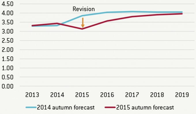 Nel grafico è indicata la pesante correzione delle previsioni tra l’autunno del 2014 e l’autunno del 2015. E nel 2015 il Fmi ha rivisto per ben due volte il Pil del mondo: a luglio e, appunto, in autunno (ottobre). A oggi la previsione più aggiornata parla di una crescita del Pil del mondo pari al 3,1% rispetto al 3,3% precedente e rispetto al 3,5% del 2014.