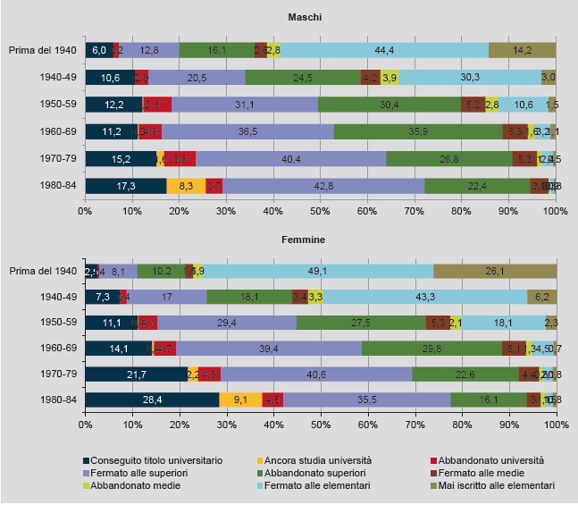 Le lezioni che si traggono da questo grafico sulla parità uomo-donna sono numerose, ma forse la più importante è che il 26,1% delle donne nate prima del 1940 non si era nemmeno iscritta alle elementari a fronte di un 14,2% dei maschi. Per le generazioni più giovani, diciamo dei figli o anche dei nipoti, le percentuali si sono praticamente azzerate per entrambi i generi ed è anche praticamente scomparsa la percentuale di persone, di entrambi i sessi, il cui curriculum si è fermato a dopo le elementari.