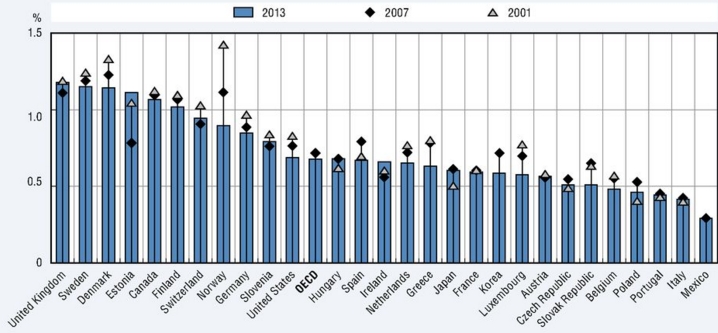 La maggior parte di “produttori di contenuti” sono in Gran Bretagna (1,18% della forza lavoro, in crescita dall’1,12 del 2007) e Svezia (1,15%, in aumento dall’1,19 del 2007). Mediamente la percentuale di persone che producono contenuti editoriali nei 29 Paesi dell’Ocse presi in considerazione, è diminuita dello 0,04% mentre in Italia, che, unico Paese al mondo insieme alla Turchia, impone ai giornalisti di iscriversi ad un apposito Ordine professionale, l’Odg, tra il 2007 e il 2013 la percentuale è rimasta identica allo 0,42% ma purtroppo questo non impedisce al nostro Paese di finire in penultima posizione nella classifica generale.