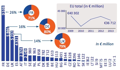 Ma è anche il Paese europeo che nel 2013 ha ottenuto più permessi per esportare armi nel mondo, destinati anche alla guerra in Siria compresa. Il grafico dimostra che dopo le primavere arabe e all’alba della nascita dei gruppi fondamentalisti, la Francia ha esportato armi per un valore complessivo di oltre 9,5 miliardi e 6,7 miliardi sono stati incassati dalla vendita di armi a Paesi fuori dall’Unione europea.