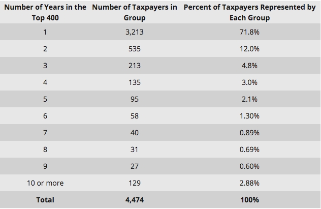 L’Irs è andata a vedere quali erano gli appartenenti alla classe dei top 400 dei contribuenti Usa, i super ricchi americani, quelli che sono i più ricchi tra l’1% di americani più ricchi, nel 1992 e quali erano quelli del 2013. Il risultato è che, considerando solo i salari, in questi anni ci sono stati 4.474 contribuenti super-ricchi ma anche che il 71,8% di questi, cioè i 3.213 americani, che erano super-ricchi nel 1992, lo sono stati solo per un anno. Soltanto 129 persone che erano nella top 400 nel 1992 lo erano ancora nel 2013.