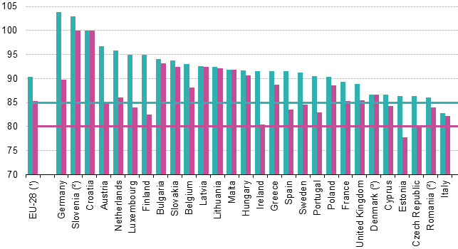 Il secondo dato che emerge dal rapporto Eurostat (vedi grafico sopra) riguarda gli obiettivi di riutilizzo e recupero fissati dall’EU: in pratica, l’85% dei materiali con cui è fatta un’auto, tra plastica, alluminio e altro, deve tornare sul mercato sotto qualsiasi altra forma (linea verde orizzontale). Tutti bravi in Europa tranne noi: nel 2013 siamo gli unici ad aver mancato il bersaglio, fermandoci a quota 82,2%.
