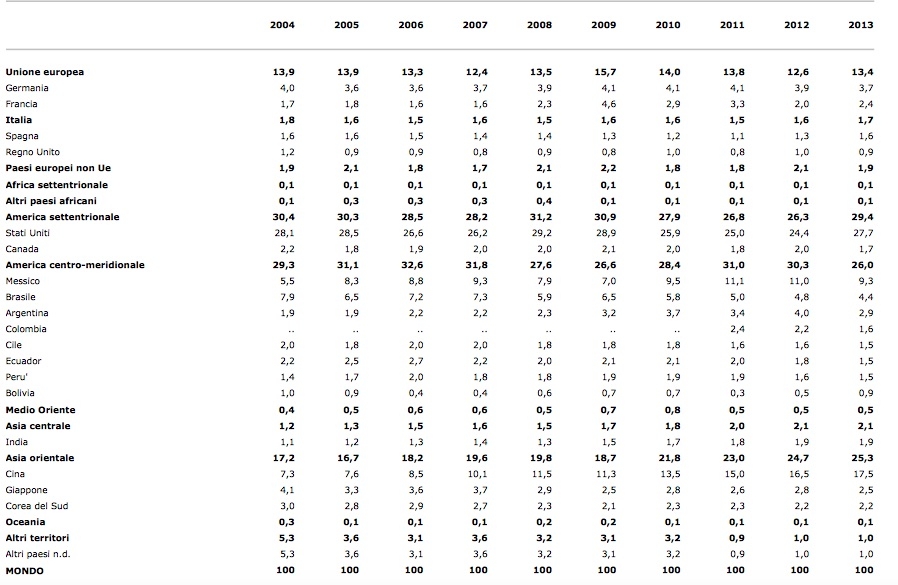 Per quanto riguarda l’importazione di prodotti provenienti dal nostro Paese, l’Italia risulta essere il terzo partner europeo della Colombia, dopo Germania e Francia con una quota di mercato attorno all’1,7% rimasta pressoché stabile negli ultimi 10 anni. La parte del leone nell’export in Colombia la fanno gli Stati Uniti con il 27,7% di quote (dato del 2013), seguiti dai Paesi dell’America centro-meridionale e dall’Asia orientale. L’Europa viene dopo con il 13,9%.