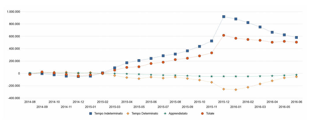 I contratti a tempo indeterminato firmati nei primi sei mesi del 2016 sono stati 1.807.594, in aumento rispetto agli stessi periodi degli anni 2015 e 2016. Non solo, la retribuzione media è diminuita dello 0,5% rispetto al 2015. I giovani assunti come apprendisti sono stati 113.378, più che nel 2014 e nel 2015.