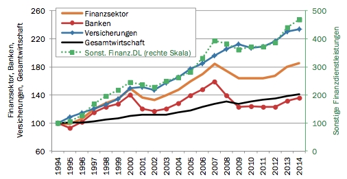 Solo il settore bancario (linea rossa) in senso stretto, dal 2009, non si è più ripreso, mentre è letteralmente volato il valore aggiunto prodotto dalla cosiddetta “finanza alternativa” (linea verde). Molto bene le assicurazioni (linea blu) e la finanza svizzera (linea gialla). Se si confronta il valore aggiunto dell’intera economia del Paese e la si confronta con quello del settore finanziario si scopre che mentre la prima, dal 1994 al 2014, è aumentata del 40,8%, la seconda è cresciuta dell’85,5%: più del doppio.