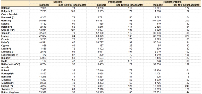 La maggiore concorrenza tra dentisti è in Grecia dove ve ne sono 127 ogni 100mila abitanti, la quota più alta in Europa. Il maggior numero di farmacisti per 100mila abitanti è invece in Belgio con 119 mentre la Finlandia è zeppa di fisioterapisti: 246 ogni 100mila abitanti.