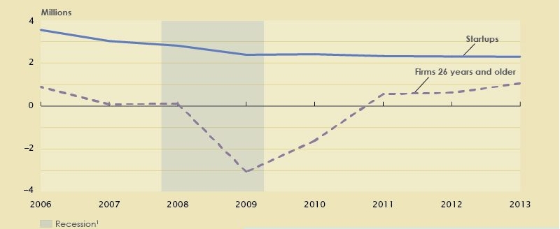Il grafico mostra che nel 2013 il contributo alla creazione di nuovi posti di lavoro è venuto soprattutto dalle aziende più vecchie, quelle della old economy, con almeno 26 anni di vita. Queste hanno creato, nel 2013, 1 milione di nuovi posti di lavoro mentre il lavoro nella new economy ha creato 2,3  posti, molto meno dei 3,5 milioni del 2006.