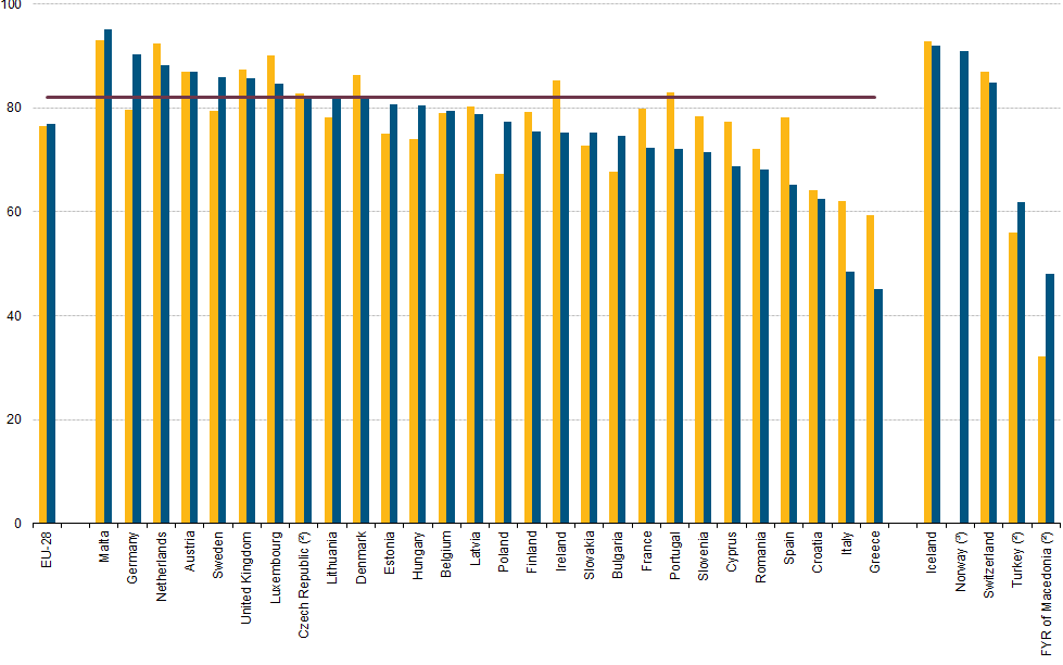 Dire che siamo lontani dagli obiettivi fissati dall’Europa è un eufemismo. La Cooperazione comunitaria nel settore dell’istruzione e della formazione (per tutti: ET 2020), ha infatti fissato all’82% il tasso di occupazione dei neolaureati da raggiungere entro il 2020. La rincorsa per noi sarà lunga. Sono invece già arrivati Germania e Malta, Paesi Bassi e Austria, Svezia, Regno Unito, Lussemburgo, Repubblica Ceca e Lituania.