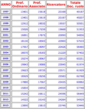 Il numero di docenti è cresciuto incessantemente dal 1997. Poi il blocco