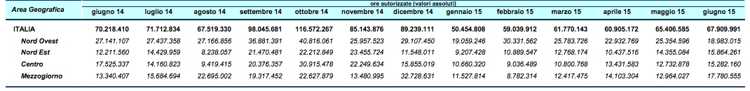 A giugno 2015 le ore autorizzate sfiorano quota 68 milioni. A gennaio erano 50,4