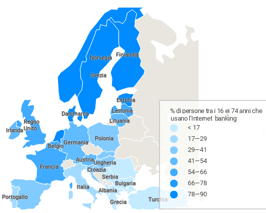 La mappa rappresenta la percentuale di residenti tra i 16 e i 74 anni che accedono al proprio conto bancario via Internet per effettuare operazioni o anche solo per controllare l’estratto conto.