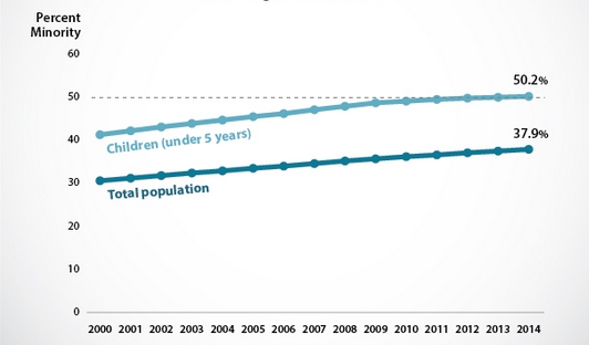 Nel 2014, per la prima volta nella storia degli Stati Uniti, i bambini con meno di 5 anni d’età che appartengono a minoranze (cioè tutti i non bianchi) sono la maggioranza rispetto a tutti i bambini della stessa età. Sono, infatti, il 50,2% mentre sul totale della popolazione americana il peso delle minoranze è pari al 37,9%.