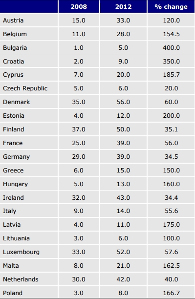 Agli italiani non piace comprare pacchetti vacanze online. Nella tabella qui sopra è indicata la quota di viaggi sul totale che i cittadini di vari Paesi europei hanno acquistato attraverso internet nel 2008 e nel 2012.