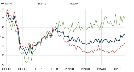 Uno degli indicatori più importanti è quello degli ordinativi. Gli ultimi dati disponibili riguardano luglio 2015 e dicono che sono aumentati dello 0,6% rispetto al mese precedente. Nel grafico la linea “0” identifica il 2010 e mostra che complessivamente gli ordini hanno superato, seppur di molto poco, quelli di 5 anni fa. Gli ordini interni sono ancora ampiamente sotto il livello di 5 anni fa, ed è per questo che è particolarmente positivo che a luglio proprio il mercato interno siano aumentati del 3,1% mentre quelli esteri sono calati del 2,9%.