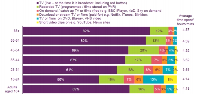 Il mercato è quello della Gran Bretagna dove la “vecchia” tv tiene incollati i ragazzi tra i 16 e i 24 anni come minino 2 ore al giorno su un totale di 4,14. Quelli che spendono meno tempo davanti ad un video, però, sono quelli appartenenti alle due fasce d’età superiori: solo 3,53 e 3,52 ore in media al giorno. Di questo tempo tra il 61% e il 67% è ad appannaggio della tv, cioè più di 2 ore al giorno.