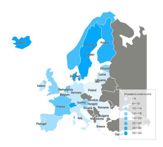 La mappa fotografa la percentuale di adulti dai 25 ai 54 anni coinvolti nella formazione permanente, cioè che frequentano corsi d’aggiornamento o che studiano nuove materie e tecnologie, nei Paesi dell’Unione Europea.