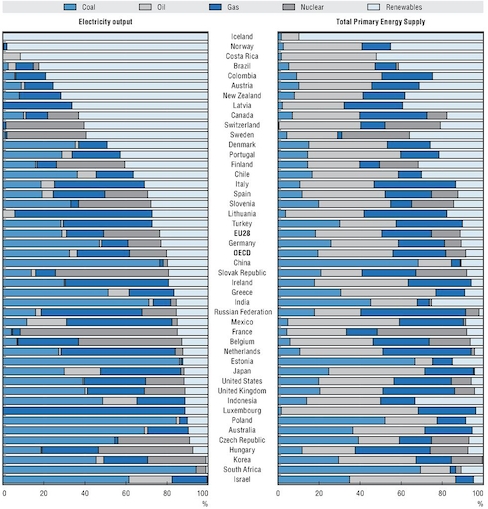 Non sarà facile. Nel grafico sono indicati i mix di produzione di elettricità (a sinistra) e di Total output (produzione più importazione e riserve) di ogni Paese. Il quadro non potrebbe essere più diversificato: da un’Islanda che produce quasi tutto il suo fabbisogno attraverso energie rinnovabili alla Slovacchia che usa prevalentemente il nucleare, dalla Germania “carbonifera” all’Italia che fa largo uso di gas naturale.