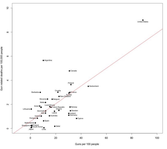 Il grafico è stato realizzato dal centro studi Tewksbury Lab, che fa parte dell’Università di Washington, e mette a confronto il numero di armi in possesso dai cittadini di uno Stato e i morti. Come si vede gli Stati Uniti hanno una posizione sideralmente lontana rispetto a quella occupata dagli altri Paesi occidentali. Il tasso di omicidi negli Stati Uniti è sei volte più alto di quello rilevabile in Canada, sette volte di quello svedese e addirittura 16 volte di quello tedesco.