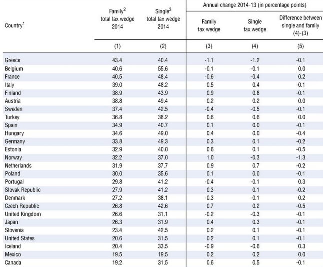 La tabella qui sopra è tratta dal rapporto Ocse 2015 sui sistemi fiscali del mondo. In particolare questa mette a confronto le tasse sulla famiglia e le tasse che gravano su un single. L’Ocse ha preso in considerazione una famiglia composta da padre, madre e due figli nella quale ci sia un solo percettore di reddito. Il risultato è che le tasse sulla famiglia (l’Ocse parla di “cuneo fiscale” ) in Italia si portano via il 39% del reddito della famiglia rispetto al 48,2% del reddito di un single. Tra il 2013 e il 2014 questo peso fiscale è peraltro aumentato dello 0,5% per quanto riguarda la famiglia e dello 0,4% per quanto riguarda i single.